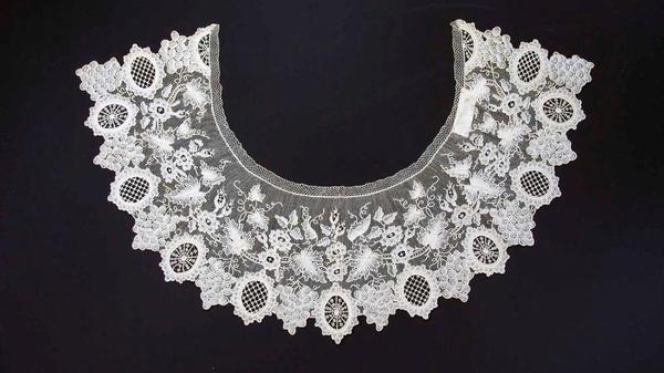 Grape and vine motifs with shadow effect decorate this cotton Alençon lace collar from the late 19th century. Horsehair was used to support picots on the outside edge and on some interior motifs. The pattern for this collar is in the Musée des Beaux-Arts et de la Dentelle, Alençon, France. Beverly Wolov/National Museum of American History